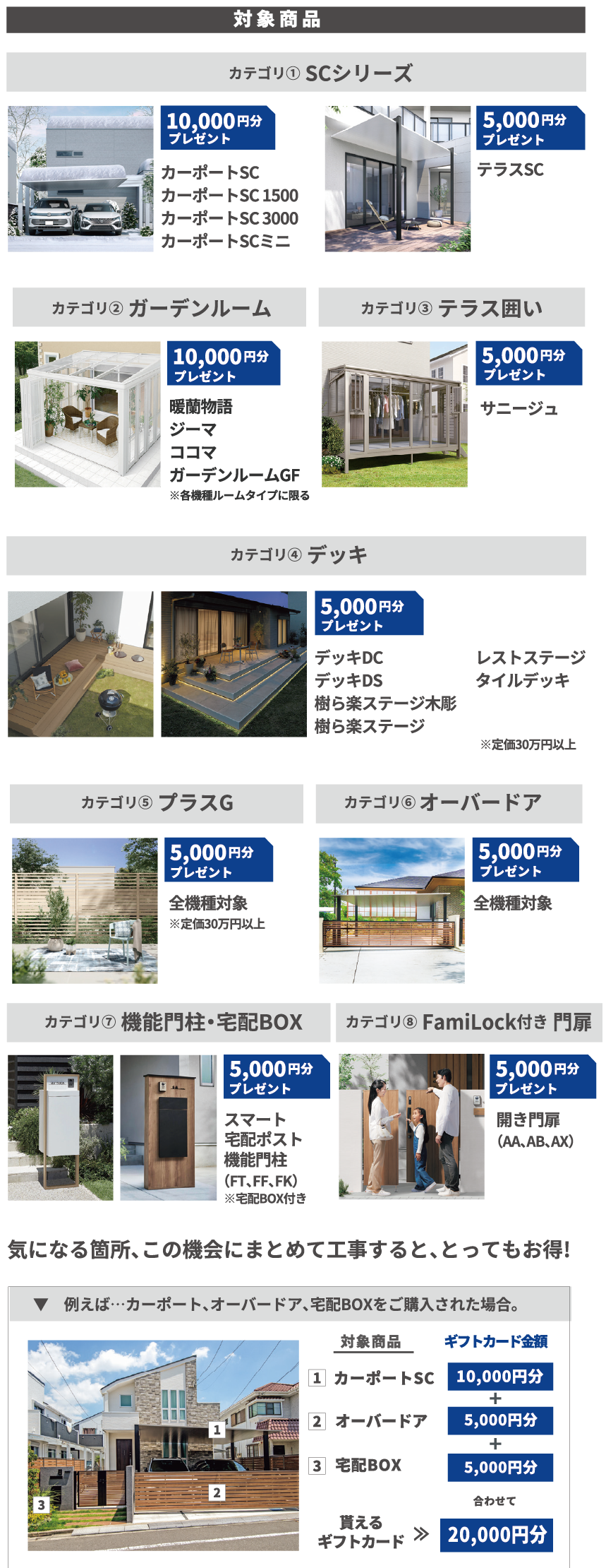 例)SCシリーズカテゴリで、カーポートSCとテラスSCを購入⇒キャッシュバック金額は10,000円